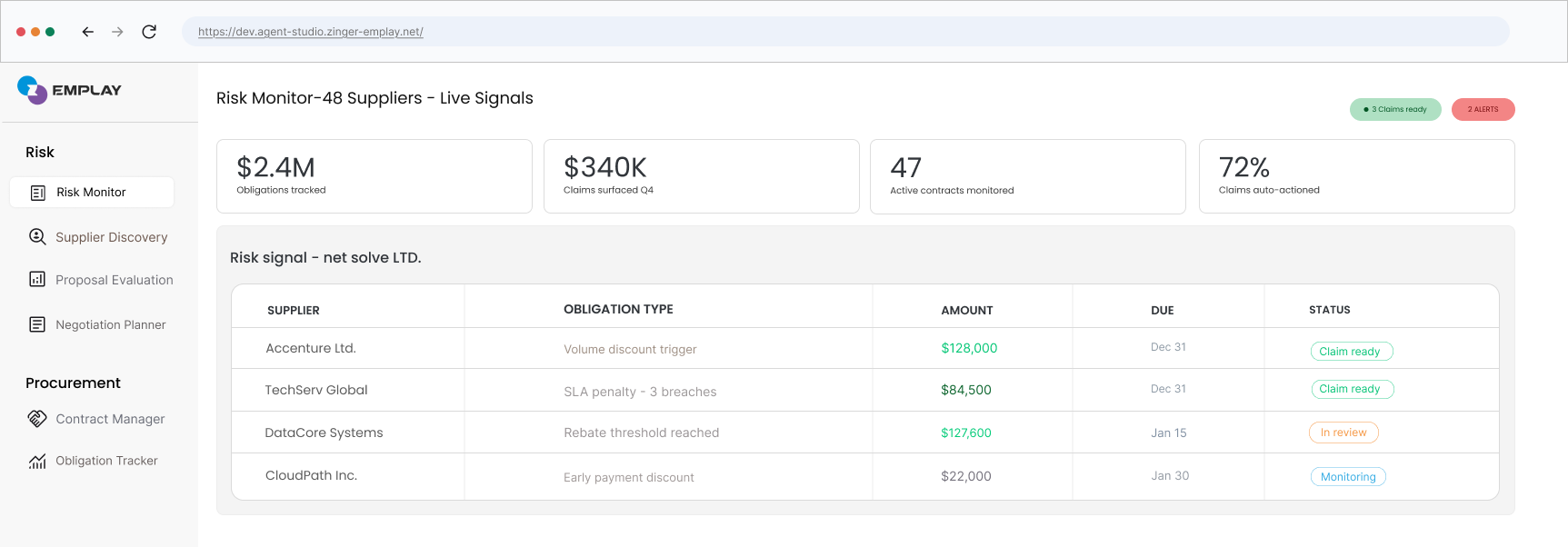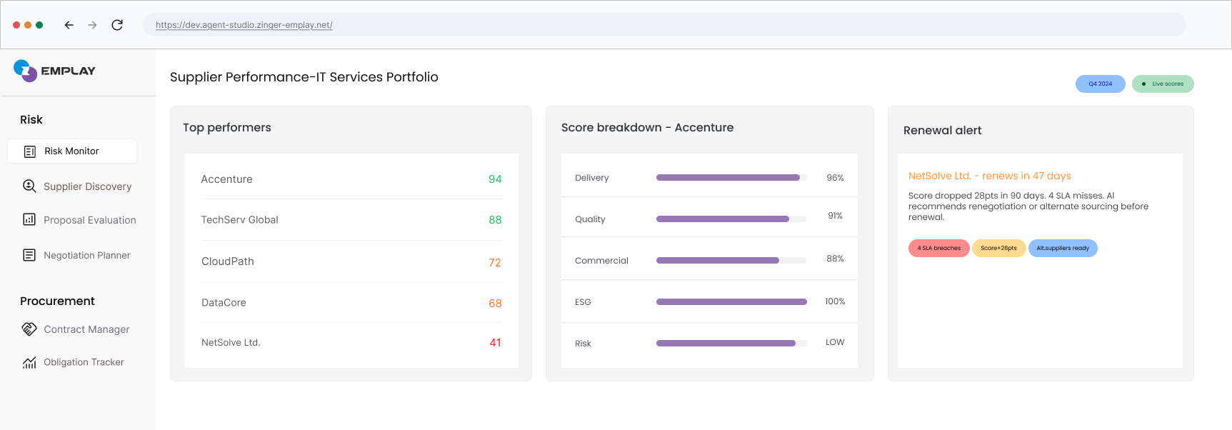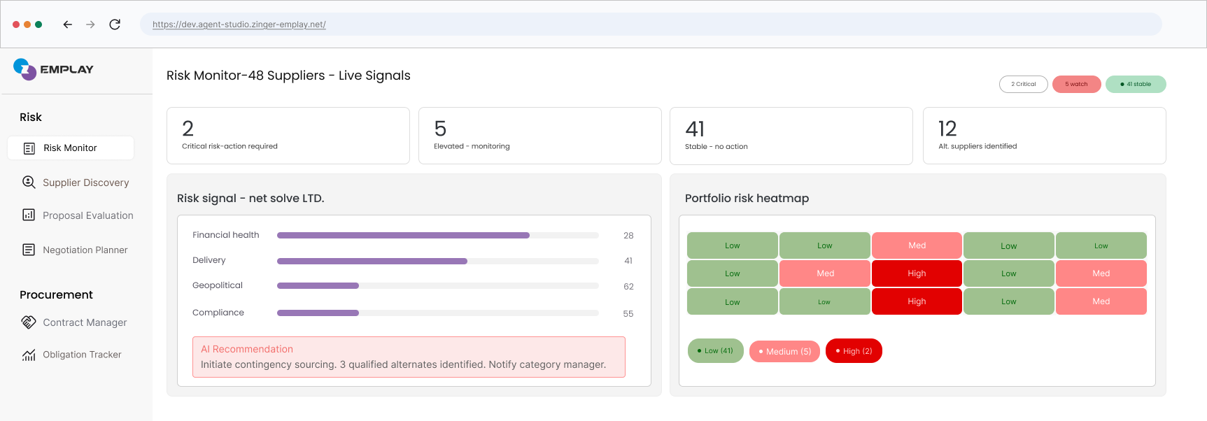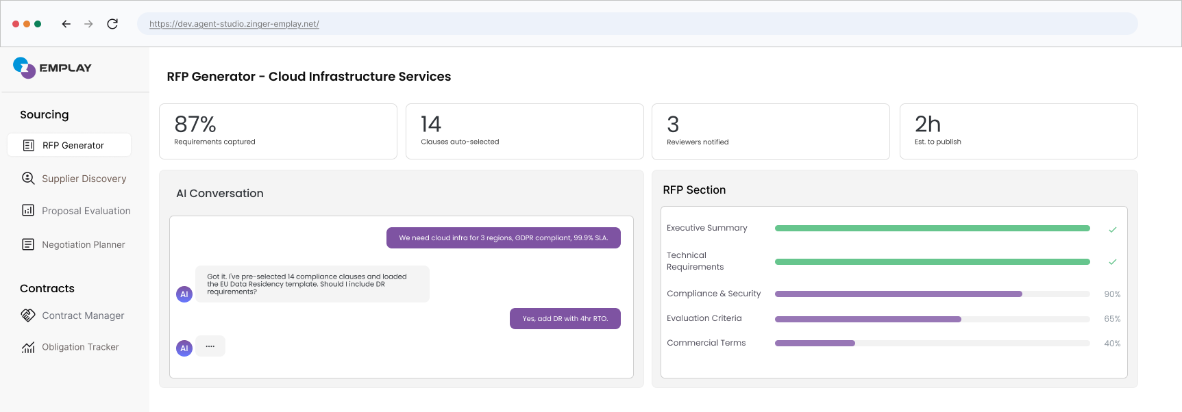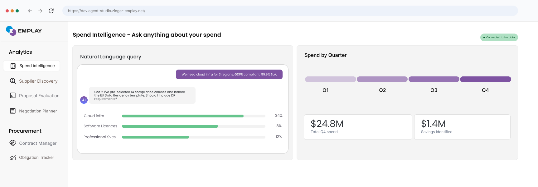 Emplay AI runs the cycle. Category specialists validate every output and hold suppliers to account — so every recommendation is enterprise-ready before it reaches your desk. Procurement domain expertise baked in, not bolted on.